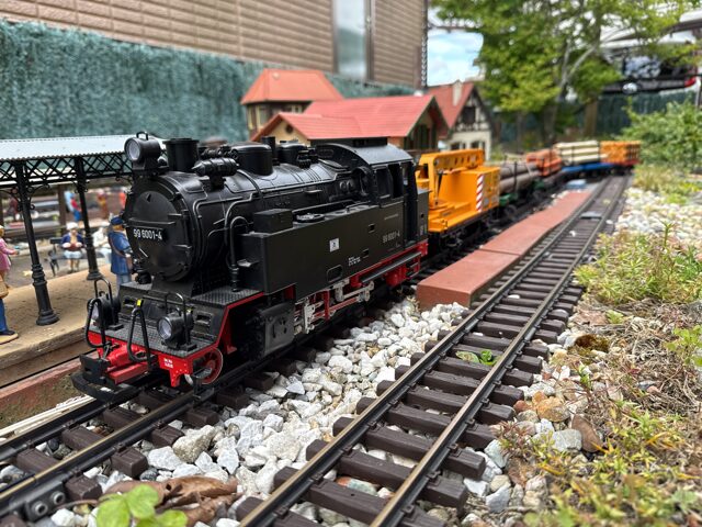 今日は、HSB steam locomotive 99 6001-4(LGB 25802)に、クレーン車、そして、丸太、鉄骨、鋼管、材木を積んだ貨車をひかせました。