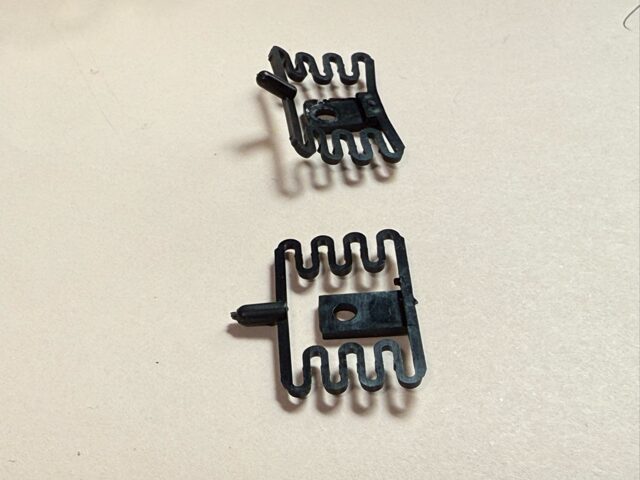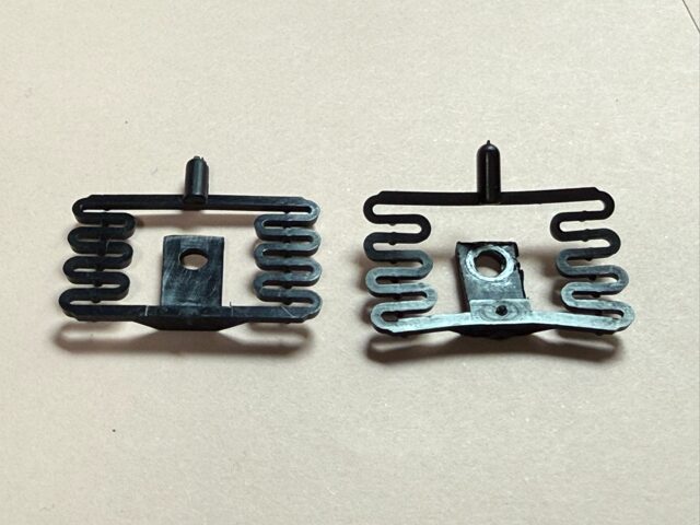 外したバネ(上)と、新品のバネ(下)を見比べると、外したバネは曲がってしまっているのがわかります。