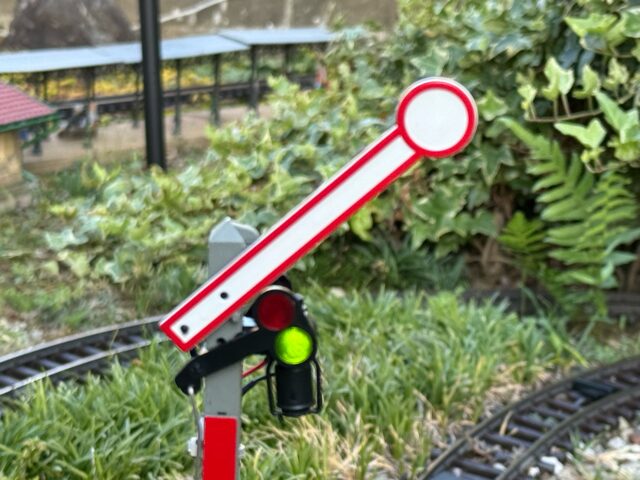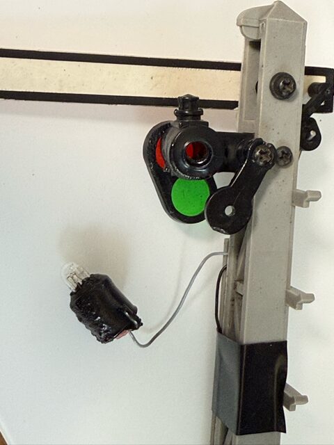 現在、LGB 社製の信号機が5つ設置してあります。電球の位置が自然と下がってくるのですが、そのまま長時間点灯していると、熱を持ち、電球の収納部分のプラスチックが溶けてきました。下の写真は、電球の収納部分が溶けて、捥(も)げてしまった様子です。