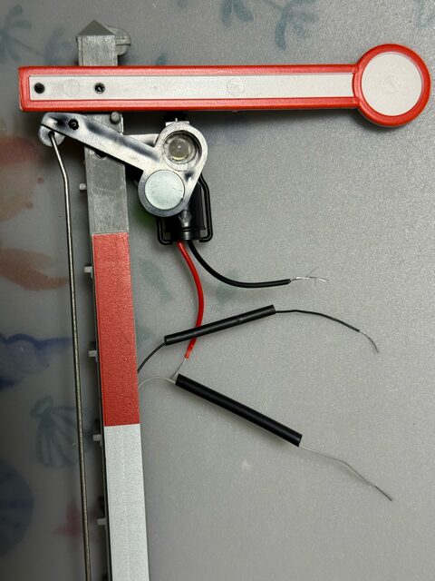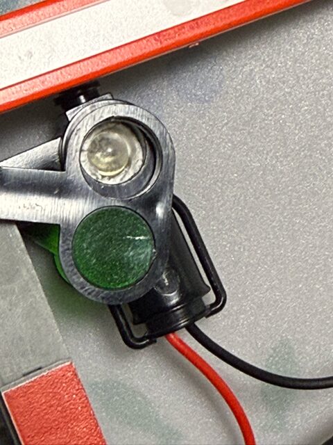Amzonで抵抗付き24V対応のLEDを購入しました。線路には交流が流れていますので、1アンペアの整流ダイオードを極性を正しく半田付けしました。