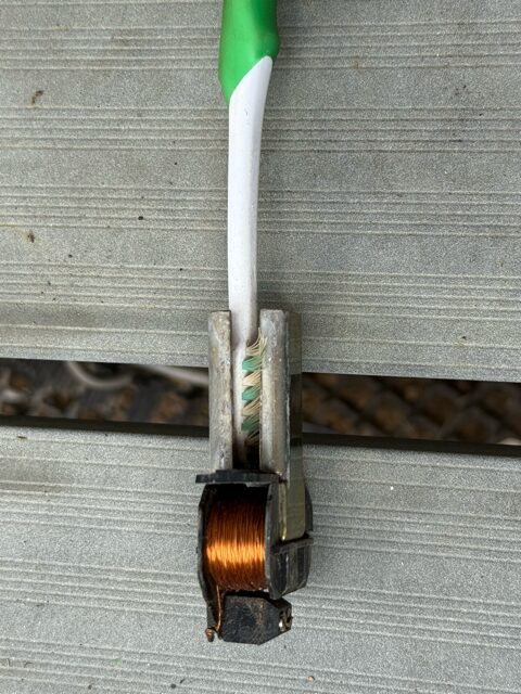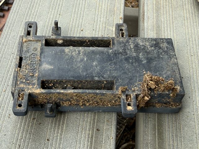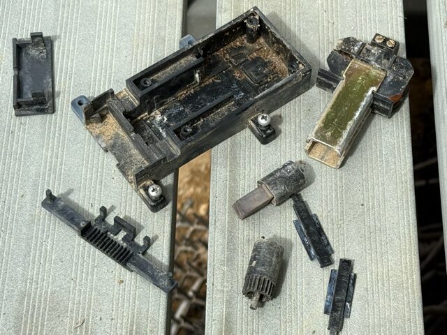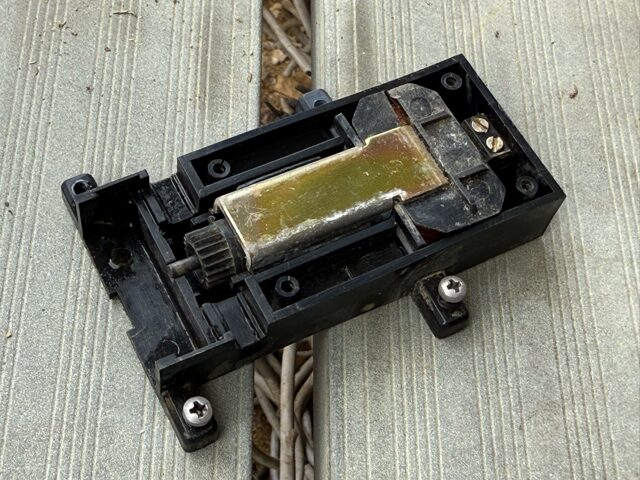 ポイントマシンの清掃 トラブル 2025.09.23 一つのポイントマシンが、切り替わらないことが増えてきました。 こういう時は分解掃除です。 線路から取り外すと土がたくさんついています。 分解を始めました。 中まで土が入り込んでいます。 歯ブラシで土をかき出し、綺麗にします。 組み立てていきます。 問題なく動作するようになりました。