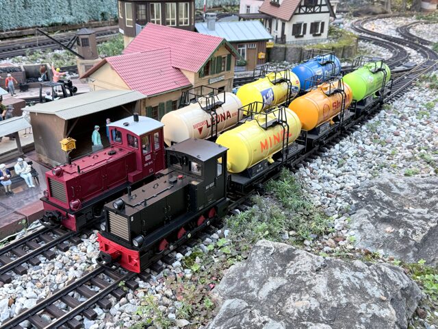 3つの列車の走行にさらに磨きをかける 写真 2025.11.292025.11.30 3つの列車が空いている経路を探して走行するプログラムをさらに見直しました。 ある場所から出発する際に、スイッチルートの切り替えが間に合わないことがたまにありました。 また、経路の探索に偏りがあったり、探索に意図的に重みづけをしないと、走行が単調になったりしていました。 今日は、そういったところを見直し、概ね修正できました。 走行の様子です。今日は似た形のディーゼル機関車3輌にタンク車をそれぞれ3輌ずつ引かせました。
