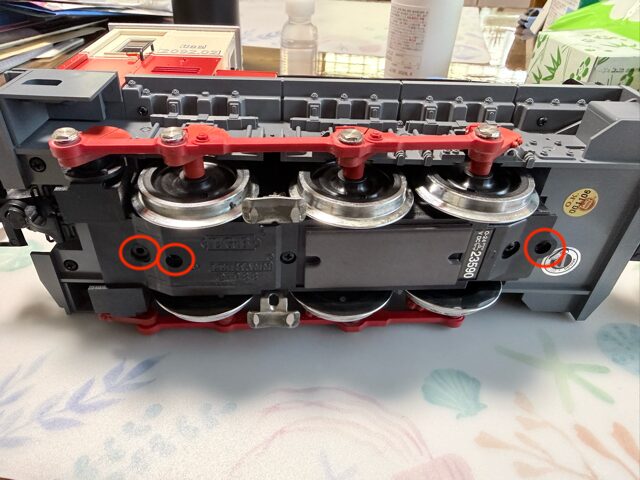 在庫している分を取り付けるために、ギアボックスを外します。この機関車は赤い丸のネジをはずせばOKです、