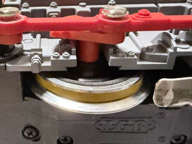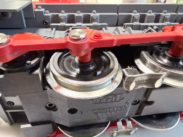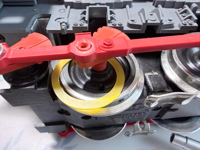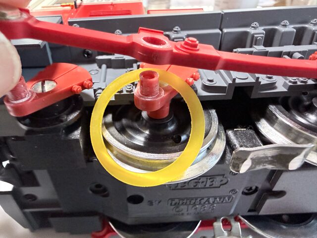 ロッドを少し持ち上げて、トラクションタイヤ(これは、LGB E126174です。色が黄色)をくぐらせます。