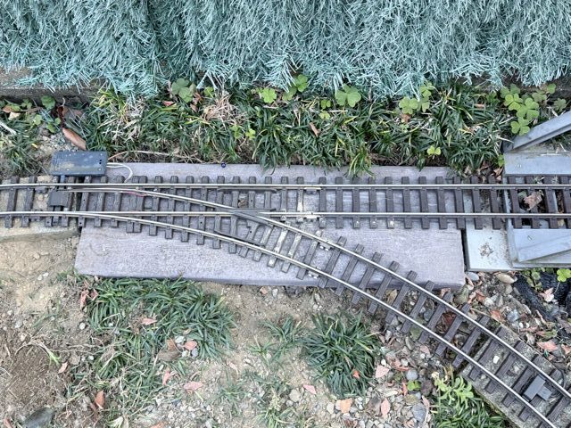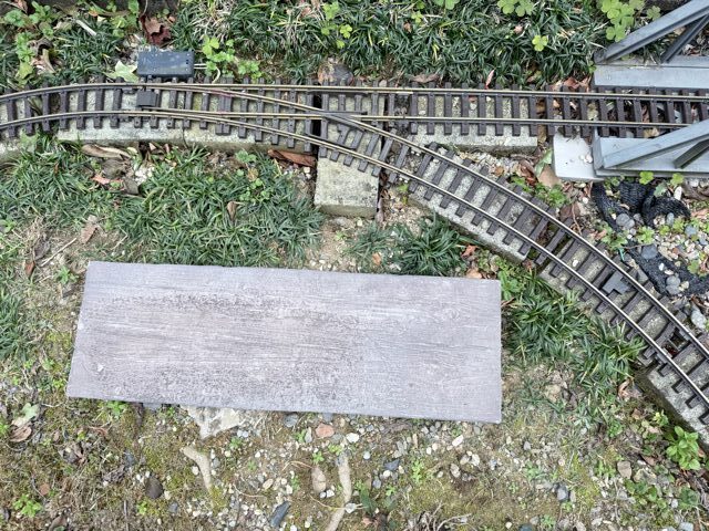 そこで、60cmX20cmの枕木風の石板を買ってきて、ポイントの下に敷きました。